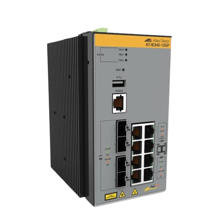 [IE340-12GP] Allied Telesis 8x 10/100/1000T, 4x 100/1000X SFP, Industrial Ethernet, Layer 3 Switch, PoE+ Support