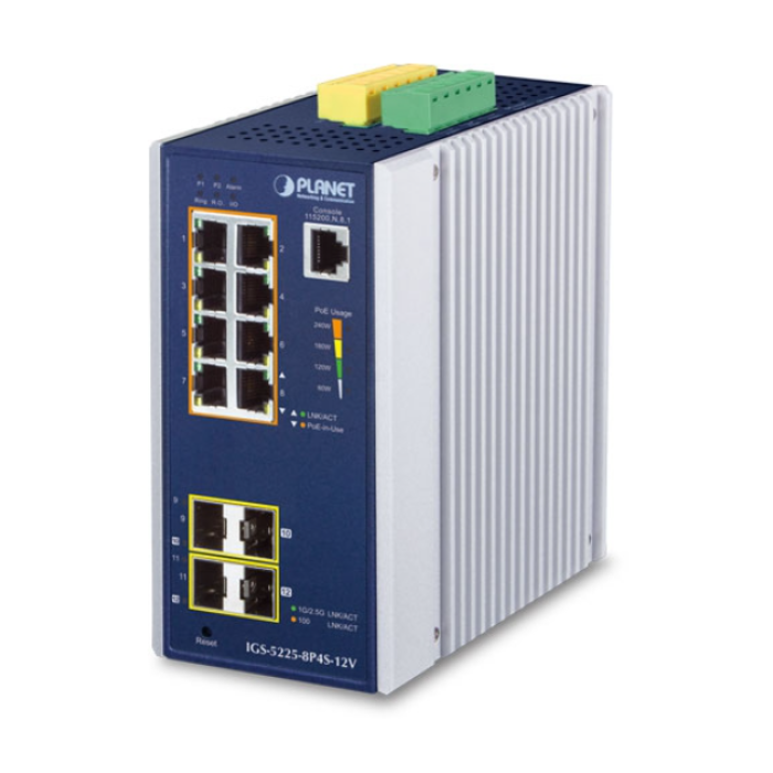 [IGS-5225-8P4S-12V] Planet Industrial L2+ 8-Port 10/100/1000T 802.3at PoE + 2-Port 100/1G SFP + 2-Port 100/1G/2.5G SFP Managed Ethernet Switch w/ 12V Booster