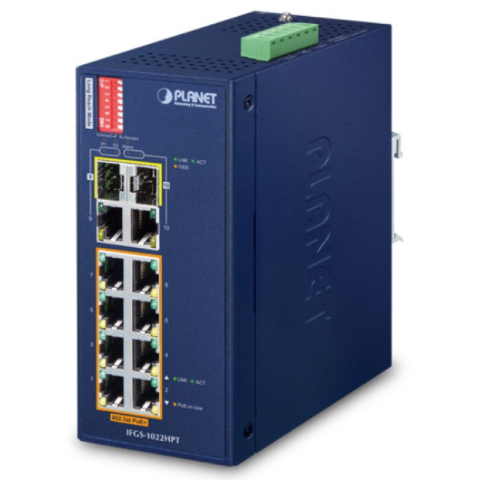 [IFGS-1022HPT] Planet Industrial 8-Port 10/100TX 802.3at PoE + 2-Port Gigabit TP/SFP Combo Ethernet Switch