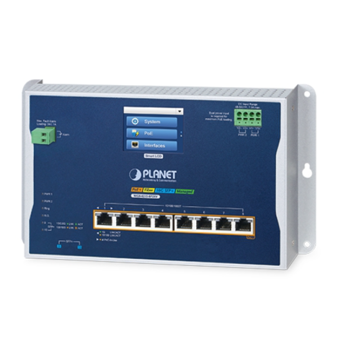 [WGS-4215-8P2XV] Planet Industrial L2+ 8-Port 10/100/1000T 802.3at PoE + 2-Port 10G SFP+ Wall-mount Managed Ethernet Switch with LCD Touch Screen