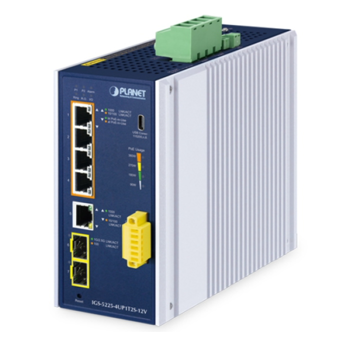 [IGS-5225-4UP1T2S-12V] Planet Industrial L2+ 4-Port 10/100/1000T 802.3bt PoE + 1-Port 10/100/1000T + 2-Port 1G/2.5G SFP Managed Ethernet Switch w/12V Booster