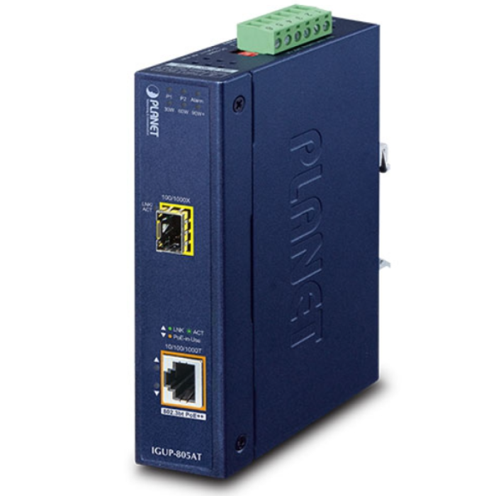 [IGUP-805AT] Planet Industrial 1-Port 100/1000X SFP to 1-Port 10/100/1000T 802.3bt PoE++ Media Converter
